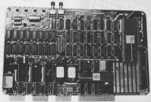 Photo 1: The very large integrated circuit (IC) in the upper right is the 68000. The other large IC near the wire-wrap area is the 48-pin MC68230 parallel interface/timer. The two serial interface ICs are at lower left. The edge connectors on the bottom are, from left to right, serial port 2 (host), serial port 1 (terminal), port 4 (cassette recorder), and port 3 (Centronics-type parallel printer).