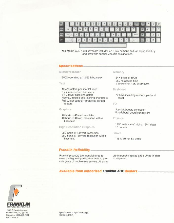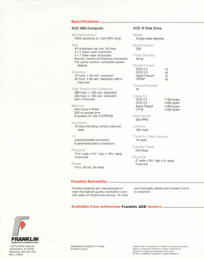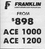 The Franklin ACE was one of the earliest commercial clones of the Apple 2 computer. Produced in 1982, the Ace100 was replaced by the Ace1000 the same year. Franklins were pretty much an exact copy of Apples design, and Franklin ceased production after losing a court battle with Apple.