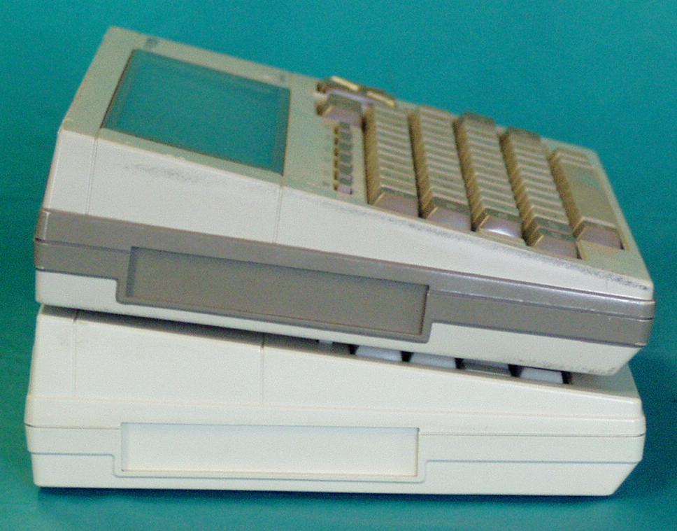 The TRS-80 Model 100 and the NEC 8201A/8300 are examples of a series of battery powered powertable computers based on a common design by Kyocera. These were the first truly portable computers, and were released in 1983. The NEC machines contained a BASIC interpreter, text editor and telecom application. The TRS-80 Model 100 added an address boock and scheduler.