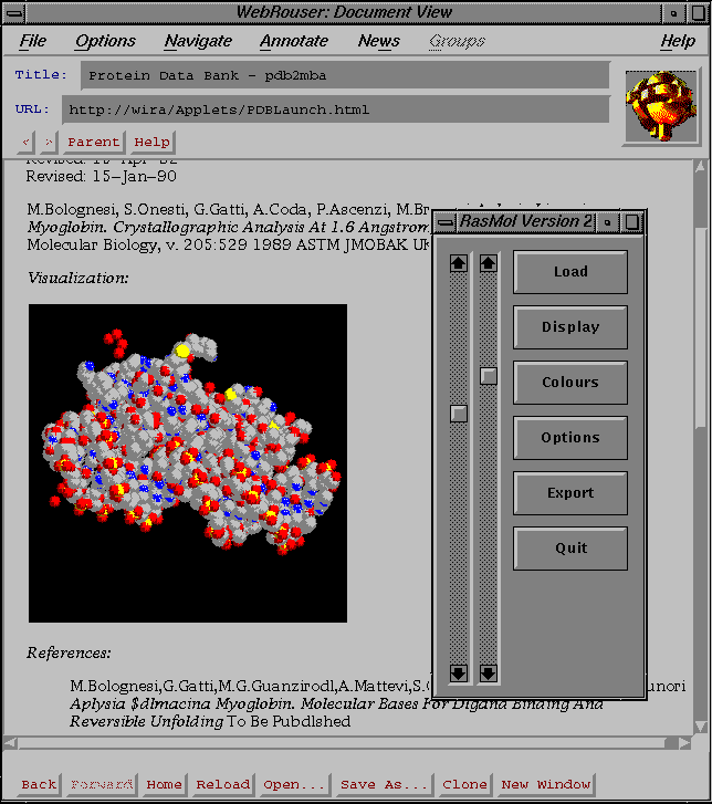 Figure 1 is a Weblet-based version of the public-domain RASMOL visualization program that lets users view, analyze, and visualize a 3-D protein structure from within the Web page. A single programmer converted the original RASMOL source code into Weblet form in only ten hours.
