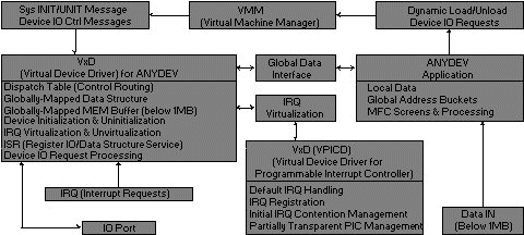 Figure 1 presents an overview of the VxD interfaces addressed in this article. When a Win32 application attempts to load a dynamically loadable VxD, control is passed to the Windows 95 virtual machine manager (VMM) to supervise the loading process. The VMM is the heart of Windows 95 and is essentially a preemptive, multitasking operating system; it supervises virtual machines (VM) and VxDs. Under Windows 95, each application executes in its own VM. During the execution life cycle of a dynamically loaded VxD, there are only three pertinent messages initiated from the VMM to the VxD: Sys_Dynamic _Device_Init, Sys_Dynamic_Device_Exit, and W32_DeviceIoControl. By convention, these three messages are fielded from a control dispatch table within the VxD.
