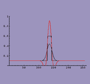 Figure 4: Adding the unsharp mask to the test data yields an enhanced version (red), which I've shown together with the actual data (blue) and the desired data (black).