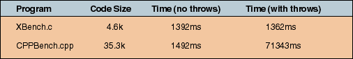 Table 1: Code sizes and benchmark results for C and C++ exception handling compiled with Borland C++ Builder 4.0, run under Windows NT.