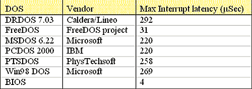 Table 4: Maximum interrupt disabling on different DOS implementations.