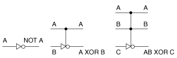 Figure 5: A reversible set of primitives in terms of which any Boolean function f(x) can be computed with roughly the same number of gates as with classical NANDs and NORs.