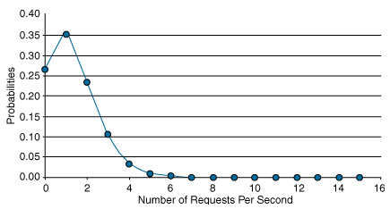 Figure 3: There is a high probability that 0, 1, 2, and 3 users will access the system simultaneously, but the probability of six or more users falls off.