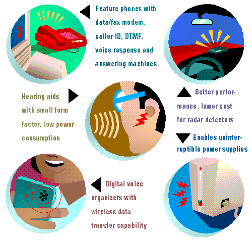 High-performance digital signal processors are now available for less than U.S. $5 in 250,000-unit quantities, thanks to a new DSP generation introduced by TI. The 16-bit, fixed-point TMS320C2xx, based n TI's TMS320C2xLP DSP core CPU, enables high-volume emerging consumer, telephony, industrial, and computer applications. "The 'C2xLP core becomes the foundation of our roadmap for dramatically increasing the performance of emerging high-volume applications," according to TI Fixed-Point DSP Applications Manager Jim Larimer. "Now designers can get 40 MIPS, a level of performance previously unachievable at this price." TI developed the 'C2xLP core, which has been shipping in volume since 1994, as a custom solution for use in applications like hard disk drives. This allows customers using the 'C2xx devices an easy migration path for cDSPs (customizable DSPs). The core is an area-efficient, 16-bit, fixed-point DSP that is source-code compatible with the 'C1x and 'C2x generations and upward compatible with the 'C5x generation. The first devices to use the 'C2xLP core CPU are the TMS320C203 and TMS320C209. The 'C203, which Larimer calls "a true application enabler," includes the core and a 16-bit timer, one synchronous serial port with a four-word-deep buffer, and a UART, providing the powerful 'C2xLP core with a full complement of application-enabling peripherals. "In addition to its performance," said Mark Mattson, TI's Fixed-Point DSP -Marketing Manager, "the 'C203's integrated peripherals help to lower chip count and system cost in applications like multi-function feature phones. In this case, the 'C203's on-chip UART provides a glueless connection from the phone to the PC via an RS-232 connection."
