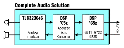 Videoconferencing audio solution for the 'C5xA complete audio solution for videoconferencing applications is now available from Signals and Software Limited for the TI TMS320C5x family of DSPs. Consisting of the three standard International Telecommunications Union (ITU) speech coder algorithms (G.711, G.722, and G.728), plus a full-duplex wide-band acoustic echo canceller, the solution offers videoconferencing equipment manufacturers a cost-effective route to solving their audio needs.