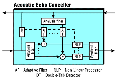 The conventional solution to handle echo caused by loudspeaking audio has been the use of voice switches, which only provide half-duplex communication. The advantage of an acoustic echo canceller is that it enables full-duplex communications by the use of adaptive filtering techniques. The adaptive filter models the impulse response of the loudspeaker-room-microphone system and subtracts the estimate of the echo from the microphone path. Signals and Software Limited has developed a 24-subband system which runs on a single 28.5-MIPS 'C53 with some additional external data RAM. By tailoring the adaptive filter lengths in the individual subbands to suit typical conference environments, the 4K words of on-chip RAM allows echo spans to be covered up to 200 ms. The 24-band structure with a separate adaptive filter in each subband, allows the processing equipment to be reduced enough such that the echo canceller will fit on a single DSP. Also, by splitting the frequency spectrum into subbands, the correlation of speech signals is reduced and the adaptive filters train more readily.