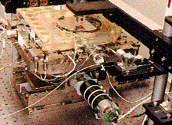 TI DSPs now used for maglev positioningTo meet the advanced requirements of deep sub-micron semiconductor production, researchers at Sandia National Laboratories (Livermore, CA) have developed a frictionless, nanometer-accurate wafer positioning system. The system uses magnetic levitation (maglev) technology controlled by a total of six TI TMS320C40 DSPs. Until recently, the nonlinear nature and computational requirements of maglev positioning has made the technology impractical for commercial wafer stepper applications, but by leveraging the processing power of multiple DSPs, the approach has now become viable. Conventional fine-resolution wafer-positioning systems use piezoelectric, linear, or DC motors which must be physically coupled to a wafer holder through lead screws and friction drives. Maglev positioning completely eliminates this physical coupling, greatly increasing positioning flexibility and accuracy. The Sandia system uses the TI DSP-based maglev positioning to enable an advanced form of projection lithography, known as extreme ultraviolet lithography (EUVL). Already, developers of the technology are experimenting with 0.1-micron gate sizes, and commercial production processes based on EUVL technology are expected within the next ten years. Sandia's experimental system, based on a Hydra quad-TMS320C40 VMEbus board from Ariel Corporation (Cranbury, NJ), controls the position of a magnetically levitated wafer holder by using data from capacitive sensors and laser interferometers. The Hydra board, coupled with a pair of Ariel's 'C40-based CommIO-IP data acquisition cards, serves as a master controller for the maglev system. Each CommIO-IP card contains one A/D IndustryPack module to acquire sensor data, and three D/A IndustryPack modules to drive the actuators. The Hydra board communicates with the CommIO-IP boards via 12 'C40 comm ports, and a 'C40 on each CommIO-IP routes data between IndustryPack modules and the 'C40 comm ports. The Hydra board also acquires laser interferometry position information from seven Hewlett Packard laser axis interferometry boards.