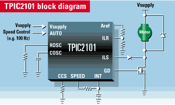 The TPIC2101 is a single-phase low-side pre-FET driver with pulse-width-modulator (PWM) output, which provides constant speed control of unidirectional DC brush motors in applications where the supply voltage changes under normal operating conditions. The device compensates for the speed variations by modifying the PWM duty cycle inversely with the changes in supply voltage. By adjusting the gate drive duty cycle to the FET, constant effective load voltage is maintained and thus constant speed achieved.