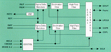DESCRIPTION The TLC320AD58 is a stereo analog-to-digital converter utilizing the sigma-delta architecture. This converter contains two separate converters with a common control and serial interface. BLOCK DIAGRAM ![]() KEY FEATURES