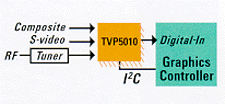 A typical PC application of the TVP5010 is shown below. The device accepts composite or S-video inputs from an analog video source, such as a camcorder or VCR. An optional tuner allows a cable TV (CATV) or broadcast television RF input. The TVP5010 converts the selected analog input signal into the desired digital video format. An I²C interface allows the graphics controller to control the TVP5010 and tuner.