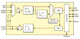 Earlier versions AICs used a successive approximation conversion technique. However, the sigma delta technique enables higher performance such as Signal-to-Noise Ratio (SNR) while simplifying the anti-aliasing filter required. This technique is now available in the TLC320AD55 (see previous article).