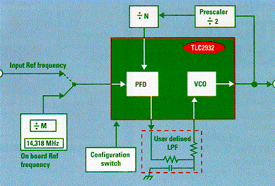 TI is offering an evaluation module, TLC2932 EVM, to assist system designers in evaluating this cost effective solution for competitive time-to-market applications. The board features an on-board programmable reference frequency generator, a set of configuration switches, a user defined low pass filter breadboard area and a frequency divider.