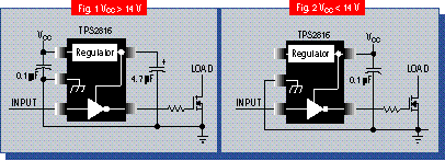 The TPS2816 through TPS2819 are low-cost, single-channel, high-speed MOSFET drivers, capable of delivering up to 2 A into highly capacitive loads. These MOSFET drivers follow the performance features of the previously released TPS2811 family of dual-channel drivers, but are single-channel devices in a SOT-23 package. This family drives 1 nF loads with a maximum 25 ns rise/fall time and a maximum 40 ns propagation delay. The high speed of these devices provides maximum efficiency for high frequency operation. The internal design of these devices inherently minimizes shoot-through currents. These devices include an internal voltage regulator that allows the 4 V to 14 V operating range to be extended to 40 V, for higher voltage applications. The regulator can power other PWM control circuitry provided the power dissipation requirements do not exceed the SOT-23 package limitations. The regulator input can be left disconnected if not used. Implementations with and without the internal regulator are shown above. The TPS2816 and TPS2818 are single inverting drivers, and the TPS2817 and TPS2819 are single noninverting drivers. An additional feature in the TPS2816 and TPS2817 is the implementation of an active pull-up circuit on the input pins. This eliminates the need for the external pull-up when using an open-collector PWM. Ideally suited for applications such as: off-line power supplies and DC-DC converters up to 1-kW, motor drivers, and relay or solenoid drivers. These devices provide a cost effective solution in a 5-pin SOT-23 package.
