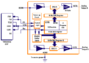These new, programmable, dual 12-bit and 10-bit digital-to-analog converters (DACs) offer designers high-speed and low power in combination with an easy interface to TI's line of TMS320 digital signal processors (DSPs).