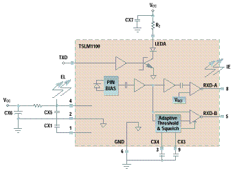 The TIR2000 and TSLM1100, together with software and development support, provide a fully compliant infrared transmission solution. The TIR2000 is a high-speed infrared controller that supports transfer rates up to 4 Mbps. Functionally, it serves as an interface between the host systems ISA bus and the infrared transceiver by encoding and decoding IR information in accordance with IrDA standard 1.1. It also supports amplitude shift keying (ASK) and TV remote control modes. In addition, the device has several features that provide a competitive advantage. The controller has selectable 16- or 64- byte FIFOs to increase system efficiency and speed. It also supports 11 IRQ options and three DMA configurations to offer the customer flexibility to use either Interrupt or DMA mode for data transfer, and also gives several options of interrupt lines or DMA channels to use in each mode. The device is ideal for battery powered systems with advanced power management and 3.3- or 5-V operation. In notebook PCs, PC peripherals, and hand-held applications the TIR2000 saves valuable board space with its small 64-pin TQFP package. The TSLM1100 is an infrared transceiver that directly interfaces with the TIR2000 controller (or slower speed TIR1000) and transfers IR signals for point-to-point wireless data transmission. This device serves as the connection to the physical world and operates from speeds of 2400 bps to 4 Mbps in full compliance with IrDA 1.1. The TSLM1100 is a multi-die module that combines a pin photodiode, a two path receiver with LED driver and an 870 nm LED. This transceiver can also interface with the TIR1000, a slower speed IrDA 1.0 compliant controller, to provide a lower speed IR transmission option.