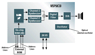 ![]() The MSP50C30 long duration speech processor features the same 8-bit microprocessor and dual synthesis channels found in the other MSP50C3X devices, with a 4K internal ROM, 1024 RAM locations, and 28 software-configurable I/O pins. This device contains 23 address and 8 data lines which allow a direct interface to external ROM (up to 8 Mbytes). With the external memory interface, the MSP50C30 is capable of long duration speech synthesis of up to 8 hours of LPC (Linear Predictive Coding). The 28 I/O pins are configurable under software control to be either inputs or outputs. As inputs, they can be configured to be either high impedance or with a passive pull-up resistor. As outputs, they can be configured to be either totem pole or open drain. A special wake-up feature allows the device to be placed in a low power 'sleep' mode from which it will wake up upon a transition on any of 8 software definable pins. A number of low bit-rate speech synthesis algorithms such as LPC, MELP (Mixed Excitation Linear Prediction), and CELP (Code Excited Linear Prediction) are available for use with the MSP50C30. These options provide great flexibility in the use of data space as well as the quality of the speech. Other options available for use with this device are ADPCM and FM Synthesis. A number of mask options are available on the MSP50C30. These include DAC output options (two-pin digital or one-pin analog), a choice of an internal or external clock, and package type (die or 100-pin QFP). Development tools available for supporting the MSP50C30 include an emulator and an assembler which are used in the code development process. These tools allow the user to compile, set breakpoints, single step through code, and examine/modify registers and memory in order to debug their code. The following table lists the complete MSP50C3X family and the features for each device. To order your free copy of the: Vol 27 May, 1998 |