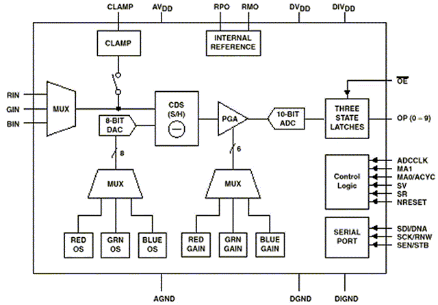 - 0 to 2.5V programmable input offset correction range with 8-bit resolution. This is optimal performance for CIS scanners, and allows full use of ADC's dynamic range.