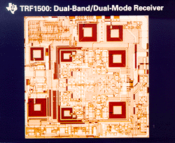 ![]() *TRF1500PFB dual band-dual mode receiver: Supports 900 MHz (analog and digital) and 1900 MHz (digital) applications. Low noise amplifier (LNA) for each band. Contains RF mixer and IF amplifiers for each band. Package: 48-pin TQFP. Price: $4.17. Status: sampling.