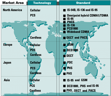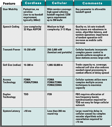 Wireless Telephone RequirementsDigital technologies are extending cordless communications to cover low-mobility, pedestrian application in environments such as office buildings, shopping malls and airports.The user requirements that drive design tradeoffs and technology choices for local-area cordless telephones and wide-area cellular telephones can be diametrically opposed. Cordless systems were invented to satisfy a need for tetherless communications in the home. These systems tend to be larger and bulkier than their more complex cellular cousins, since users do not normally carry their handsets except during calls. Until recently, analog systems with proprietary transmission standards dominated the market. Now, however, especially in Europe and Japan, digital technologies are extending cordless communications to cover low-mobility, pedestrian application in environments such as office buildings, shopping malls and airports. These cordless applications require non-proprietary standards, since the infrastructure vendor may no longer have a monopoly on subscriber instruments. While cordless phone designers have not been motivated to push the size/weight envelope for home-based systems, they will be for future low-mobility PCS systems. Since cell sizes in these applications are small, high cell capacities and high transmit powers are not a requirement. In fact, low transmission powers are an advantage, since they allow reuse of a frequency channel a short distance away. Cordless systems are used in locations where there is generally a wireline alternative; consequently, they must compete directly in terms of service quality and convenience. Standby and talk times must be measured in weeks and days -- rather than hours and minutes. Voice quality must be comparable to what is easily obtainable in the instrument on the desk or the pay phone on the wall. Cellular systems are very different. A key requirement is high mobility and the capability to hand off from one cell to the next while traveling in a high-speed vehicle. Coverage, spectral efficiency and system user capacity are additional requirements driving cellular systems to use complex modulation techniques for more efficient use of the available spectrum. Voice coding and complex error correction techniques reduce the number of bits required to reliably represent and transmit voice. Because of the large cell areas, transmitter powers are measured in hundreds of milliwatts and even watts. Table 2 compares the key requirements driving cellular and cordless telephone designs. ![]() Table 2. Different user requirements for digital cordless and cellular telephones demand different technology choices. Transmission standards are an even more significant issue with cellular and wide-area PCS phones than they are with cordless phones. Although older analog standards have supported the cellular industry successfully in the past, only digital transmissions will handle the increase in capacity required in future. Depending on the standard, digital transmission offers from twice to ten times the call capacity of analog. Table 3 lists the major digital transmission standards for wireless telephones. ![]() Table 3. Although digital transmission standards are varied, they have one big advantage -- bandwidth. Digital standards support up to 10 times the channel capacity of analog standards. Service providers are highly motivated to shift to digital transmission because the cost of supporting a digital user is a small fraction of the cost of supporting the same user on an analog system. (For IS-54B/136 that fraction is roughly 1/3.) However, unless the carrier passes on those cost savings, the end user is not so motivated. Moreover, early systems have not lived up to user expectations of higher quality. The enticement for users to switch to digital may have to come through enhanced security (through the use of digital data encryption) and a wider range of services (such as short message services, which will effectively provide embedded alphanumeric paging capabilities). |