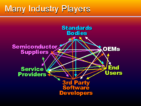 Equipment makers...semiconductor suppliers...have all been working toward the same goal of making voice communications more portable, more affordable and more widely available. And the results of the past five years speak for themselves. As we look ahead, it seems clear that the same type of vision is necessary to help the industry address its emerging challenges. We can be sure that significant changes are on the way...changes that will require an even stronger alignment among all the players in the industry — the system operators, the phone makers, the semiconductor suppliers, and every other company involved in wireless communications. We will need greater alignment across the board, because we know that end-users will be demanding a wide range of sophisticated features. This development of the wireless market will attract more and more wireless service providers. We can imagine that in the U.S., and other major markets, there will be a minimum of five carriers per region. That means the pressure will be on each carrier to differentiate its services. It will also increase the need to support roaming footprints...and increase the complexity of providing that support...within each market. Service providers are not the only ones who will face challenges, of course. Systems engineers and equipment manufacturers will also be called upon to increase the agility of their systems. We will have to start thinking about building systems and end-equipment that are capable of handling a range of personal communications tasks. One approach for doing that is to rely on software solutions. More and more, I think we are likely to find that advanced functionality will not be built into every phone. Instead, it will come via software, downloaded from the network. Tomorrow’s users will want to be able to configure...and reconfigure...their end-equipment in an endless variety of ways. And we will need to provide the systems which are capable of making that happen. Continue... |